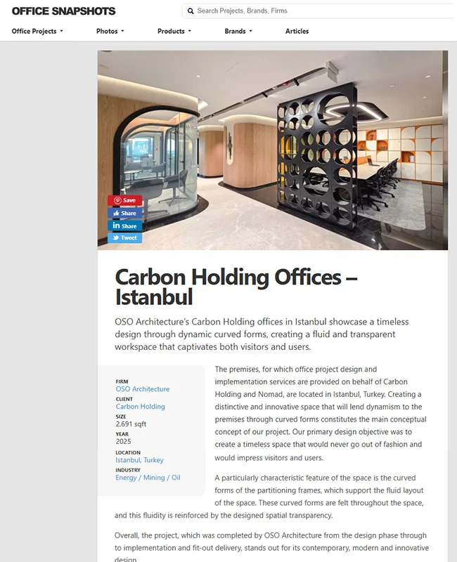 Carbon Holding ve Nomad firmaları adına ofis proje tasarım ve uygulama hizmeti verilen mekan, Istanbul Türkiye' de yer alır. Eğrisel formlarla mekana dinamizm kazandıracak, farklı ve yenilikçi bir mekan tasarlamak, projemizin ana kavramsal konseptini oluşturur. Tasarımdaki asıl hedefimiz, modası hiç geçmeyecek, ziyaretçileri ve kullanıcıları etkileyecek,...